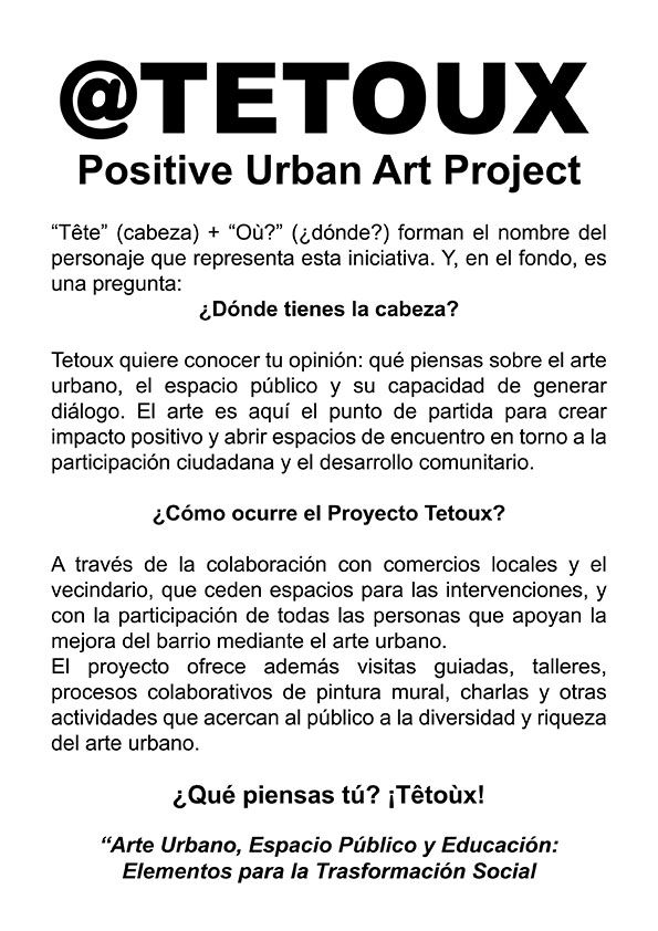 El proyecto Tetoux colabora con diversos comercios y vecinos del Distrito Centro de Madrid, interviniendo en cierres, fachadas, portales y otros espacios cedidos. Estas intervenciones consisten en pintar mensajes positivos que invitan a la reflexión, transformando los espacios en generadores de diálogo y conexión entre el individuo y la sociedad.